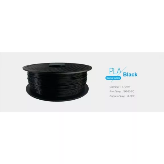Fekete színű, 1 kg-os kiszerelésű, 1,75 mm átmérőjű PLA tekercs minden FDM típusú nyomtatóhoz.