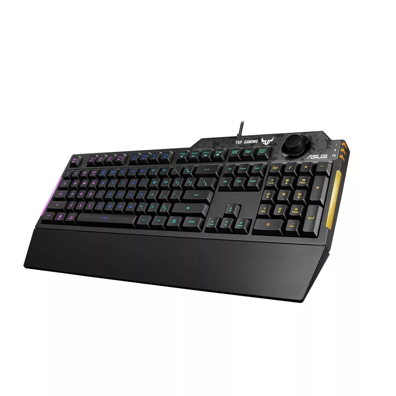 ASUS TUF Gaming K1 RGB billentyűzet dedikált hangerőszabályzó gombbal, cseppállósággal, oldalsó fénysávval és Armoury Crate technológiával Taktilis TUF Gaming kapcsolók és 19-key rollover funkció a válaszkész, megbízható teljesítményért Dinamikus RGB megvilágítási effektusok és oldalsó fénysáv a játéktér megvilágításához Dedikált hangerőszabályzó gomb a hangkimenet gyors és egyszerű beállításához Strapabíró, megerősített alumínium keret akár 300 ml-es folyadékállósággal a mindennapos stabilitás és megbízhatóság garantálásához Programozható gombok a menet közbeni makrórögzítéshez és beépített memória a személyre szabott játékhoz Armoury Crate alkalmazás kiterjedt vezérlési lehetőségekkel és intuitív felhasználói felülettel a billentyűzetet testre szabásához Levehető ergonomikus csuklótámasz a hosszú távon is kényelmes használathoz