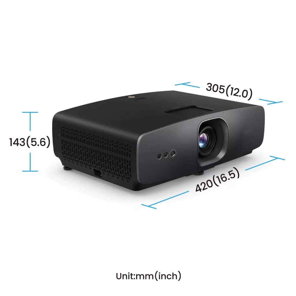 **- Megjelenítő** *Fényerő (ANSI lumen): 2500 *Felbontás: 4K UHD (3840×2160) *Képarány: 16:9 *Kontraszt arány: 2,000,000:1 *Színmélység: 30-bit (1.07 milliárd szín) *Fényforrás: 4LED *Fényforrás élettartam: a. Normál 20000 óra, b. ECO 30000 óra, c. Dynamic 20000 óra * **Optika** *Vetítési arány: 1.0~1.3 *Zoom arány: 1.3x *Lencse: F/# = 1.8 - 1.85, f = 10.55 - 15.6 mm *Offset (teljes magasság): 100% *Trapézkorrekció: 2D, (Auto) Függőleges +- 30 fok; Vízszintes +- 30 fok *Lencse eltolás (függőleges): +5% * **Képmódok** *DCI-P3 lefedettség: 90% *Rec. 709 lefedettség: 98% *Képmódok: AI Cinema, HDR AI Cinema, 3D, Bright, Cinema, FILMMAKER MODE, FILMMAKER MODE HDR, HDR Cinema, HDR10, HDR10+, HLG, ISF Day, ISF Night, User * **Kompatibilitás** *Bemeneti késleltetés: 12.8ms (1080P 120Hz), 6.5ms (1080P 240Hz), 17.9ms (1080P 60Hz), 17.9ms (4K 60Hz) *Felbontás támogatás: VGA (640 x 480) to 4K UHD (3840 x 2160) *Vízszintes frekvencia: 15K~270KHz *Függőleges letapogatási frekvencia: 23~240Hz * **I/O Interface** *HDMI-2 (HDCP2.3), HDMI-3 (2.1/HDCP2.3)(4K 120Hz * lefelé skálázás 1080p120Hz-re), HDMI-1 (2.0b/HDCP2.3), HDMI-Internal (2.0b/HDCP2.2) *USB Type A-2 (2.0/Power Supply1.5A/Reader/FW Upgrade), USB Type A-3 (2.0/Power Supply2.5A), USB Type Mini B-1 (szerviz) *RS232 be (DB-9pin) (x1) *DC 12V Trigger (3.5mm Jack) (x1) * **Audio** *Hangszóró (x2), 5W *Audio ki (3.5mm Mini Jack) (x1) *HDMI Audio Return: Igen, eARC, Dolby Atmos *S/PDIF: Többcsatornás, RAW * **Környezet** *Működési hőmérséklet: 0~40? *Tápellátás: AC 100 to 240 V, 50/60 Hz *Tipikus áramfogyasztás (110V): Max 241W, Normal 183W@220V, Eco 133W@220V *Standby áramfogyasztás: <0.5W *Zajszint (Typ./Eco.)(dB): 28/26 * **Kiegészítők** *Android TV dongle: QS02, (Standard) *Távirányító (elemmel): RCI074 *Tápkábel (régió szerint): x1 (3.0M) *Gyorsútmutató: (x1) 21L *Jótállási jegy (régió szerint): Igen *Lencsevédő: Igen *Mennyezeti konzol: CM00G3, (opcionális) * **Méretek és súly** *Méretek (Szélesség x Magasság x Mélység) (mm)