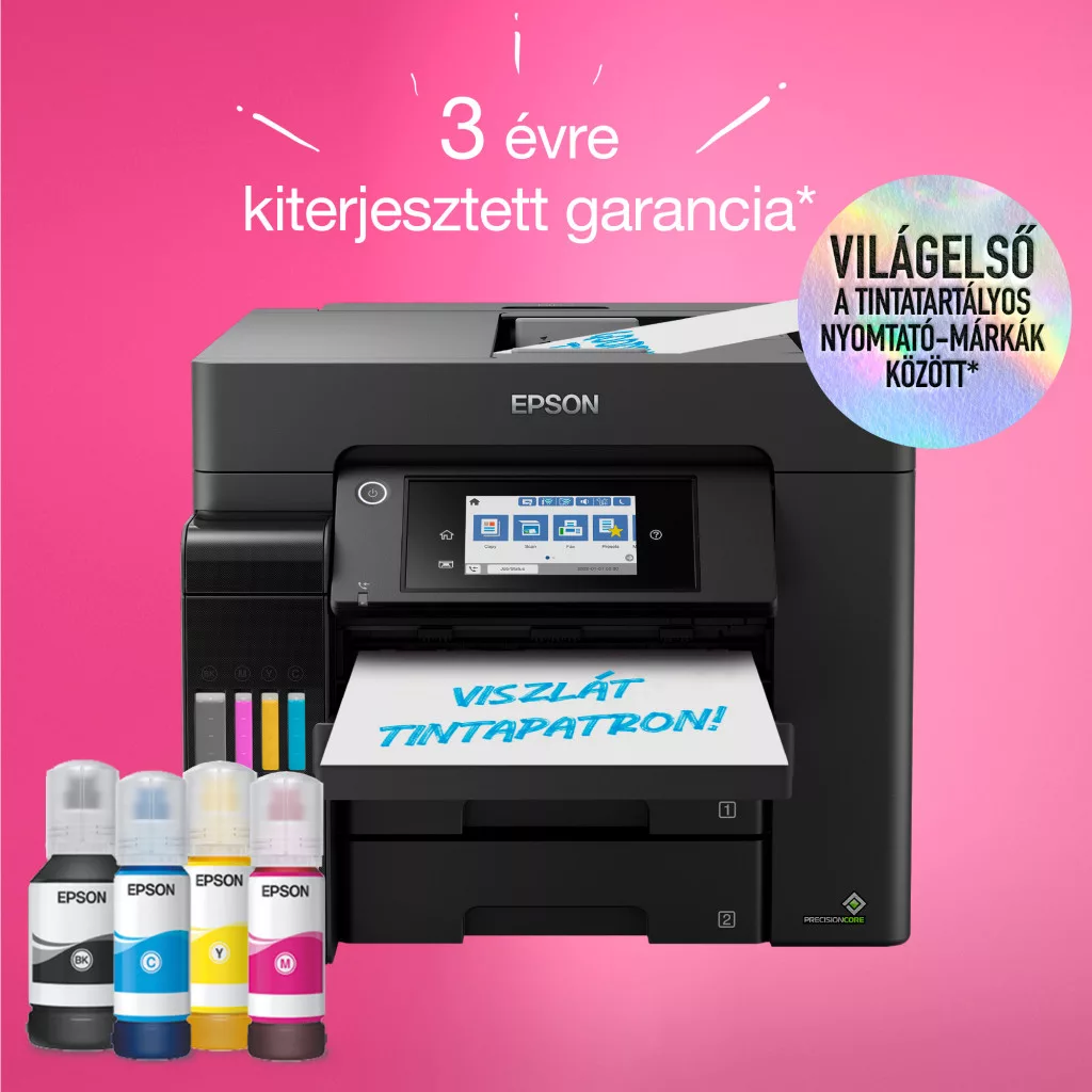 **Regisztráció esetén 3 éves kiterjesztett garancia elérhető 2026.03.31-ig! Az igényléseket a termék (végfelhasználói) vásárlásától számított 30 napon belül kell beküldeni! Regisztráció és részletek: https://www.epson.hu/hu_HU/promotions/extended-warranty *Multifunkciós: nyomtat, beolvas, másolat, faxol *Nyomtatási sebesség ISO: 25 lap/perc mono, 25 lap/perc színes *Nyomtatási felbontás: 4.800 x 1.200 dpi *Tinták: No.112 BK 127ml, C/M/Y 70ml - mind PIGMENT! + CSERÉLHETŐ Maintenance Box: C12C934591 *Szkennelési sebesség: egyoldalas ADF-ből: 27,5 oldal/perc mono, 9 oldal/perc színes; kétoldalas: 11 oldal/perc mono, 6 oldal/perc színes *Szkennelés felbontása: 1.200 dpi x 2.400 dpi; formátumok: BMP, JPEG, TIFF, multi-TIFF, PDF, PNG *Fekete-fehér és színes faxolás *3db papírtálca, tálcák kapacitása: 550 lap; DADF: 50 lapos, hátsó tálca; kiadó tálca: 125 lapos *Papírsúly: 64 g/m2 - 255 g/m2 *Csatlakozók: USB, Ethernet, Vezeték nélküli LAN IEEE 802.11a/b/g/n/ac (WiFi 5), Wi-Fi Direct *Mobil és felhőalapú nyomtatási szolgáltatások: Epson Connect (iPrint, Email Print, Remote Print Driver, Scan-to-Cloud), Apple AirPrint *A doboz tartalma: 1 szett tinta (1x127 ml BK, 3x70 ml CMY), Készülék, Tápkábel, Rövid beüzemelési útmutató *LCD kijelző: színes, érintőképernyős, 10,9 cm átlójú *A dobozban található palack(ok) kapacitása: fekete:kb.4.500 oldal, színes:kb.2.800 oldal *Garancia: 12 hónap vagy 150.000 oldal (bevivős/beküldős)