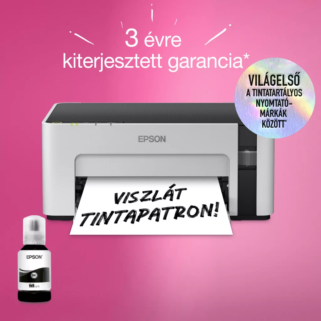 **Regisztráció esetén 3 éves kiterjesztett garancia elérhető 2025.03.31-ig! Az igényléseket a termék (végfelhasználói) vásárlásától számított 30 napon belül kell beküldeni! Regisztráció és részletek: https://www.epson.hu/hu_HU/promotions/extended-warranty *Nyomtatási sebesség ISO: 15 lap/perc *Nyomtatási felbontás: 1.440 x 720 dpi *Tinták: No.110 (120ml ~6K) vagy No.110S (40ml ~4K) PIGMENT *Papírtálca: 150 lapos; kiemeneti tálca: 30 lapos *Papírformátumok: A4 (21.0x29,7 cm), A5 (14,8x21,0 cm), A6 (10,5x14,8 cm), Legal, Letter, B5, B6, C6 (Boríték), DL (boríték), No. 10 (boríték) *Papírsúly: 64 g/m2 - 90 g/m2 *Csatlakozó: USB, Wi-Fi, Wi-Fi Direct *Mobil és felhőalapú nyomtatási szolgáltatások: Epson Connect (iPrint, Email Print, Remote Print Driver) *A dobozban található palack kapacitása: 5.000 oldal *A doboz tartalma: CD útmutató, Tinta, Készülék, Tápkábel, Beállítási utasítás *Garancia: 12 hónap vagy 100.000 oldal (bevivős/beküldős)