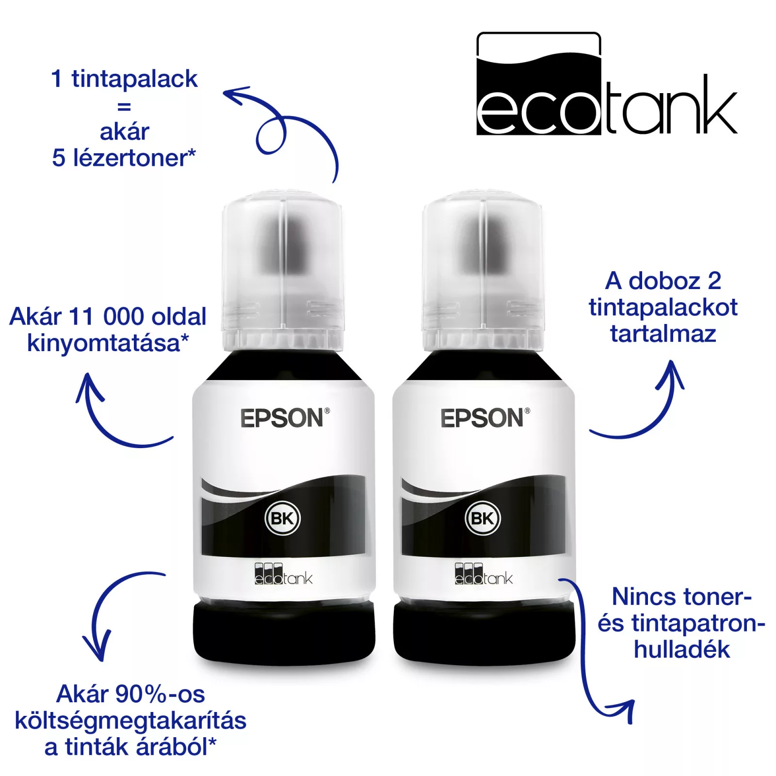 **Regisztráció esetén 3 éves kiterjesztett garancia elérhető 2025.03.31-ig! Az igényléseket a termék (végfelhasználói) vásárlásától számított 30 napon belül kell beküldeni! Regisztráció és részletek: https://www.epson.hu/hu_HU/promotions/extended-warranty *Nyomtatási sebesség ISO: 25 lap/perc *Nyomtatási felbontás: 1.200 x 2.400 dpi *Tinták: No.110 (120ml ~6K) vagy No.110S (40ml ~4K) PIGMENT; Maintenance BOX: T04D1 (C13T04D100) *Papírtálca: 250 lapos; kiemeneti tálca: 100 lapos *Automatikus kétoldalas nyomtatás (DUPLEX), Speciális médiához való hátsó adagolás *Papírformátumok: A4 (21.0x29,7 cm), Legal *Papírsúly: 64 g/m2 - 256 g/m2 *Csatlakozó: USB, Ethernet, Wi-Fi, Wi-Fi Direct *Mobil és felhőalapú nyomtatási szolgáltatások: Epson Connect (iPrint, Email Print, Remote Print Driver), Google Cloud Print *A dobozban található palackok össz. kapacitása: 11.000 oldal *A doboz tartalma: Készülék, Tápkábel, Warranty card, 2db tintapalack *Garancia: 12 hónap vagy 100.000 oldal (bevivős/beküldős)