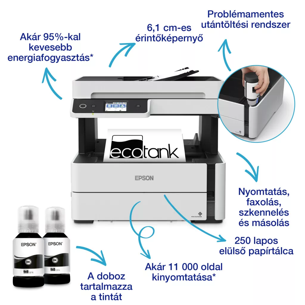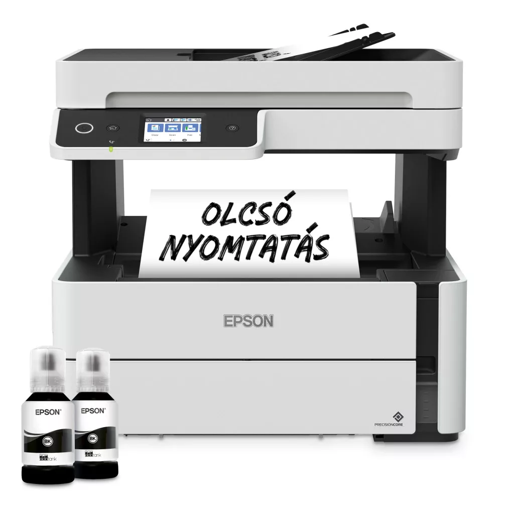 **Regisztráció esetén 3 éves kiterjesztett garancia elérhető 2025.03.31-ig! Az igényléseket a termék (végfelhasználói) vásárlásától számított 30 napon belül kell beküldeni! Regisztráció és részletek: https://www.epson.hu/hu_HU/promotions/extended-warranty *Multifunkciós: nyomtat, beolvas, másol, faxol *Nyomtatási sebesség ISO: 20 lap/perc *Nyomtatási felbontás: 1.200 x 2.400 dpi *Tinták: No.110 (120ml ~6K) vagy No.110S (40ml ~4K) PIGMENT / Maintenance Box: T04D1 (C13T04D100) *Szkennelési sebesség: 7 oldal/perc (mono/színes) *Szkennelés felbontása: 1.200 dpi x 2.400 dpi, formátumok: BMP, JPEG, PICT, TIFF, multi-TIFF, PDF, PNG *Fekete-fehér és színes faxolás *Papírformátumok: A4 (21.0x29,7 cm), Legal, Letter, Executive, A5 (14,8x21,0 cm), A6 (10,5x14,8 cm), B5, B6 *250 lapos papírtálca; kiadó tálca: 100 lapos *Automatikus kétoldalas nyomtatás/DUPLEX (A4, egyszerű irodai papír), Speciális médiához való hátsó adagolás *Papírsúly: 64 g/m2 - 256 g/m2 *Csatlakozók: USB, Ethernet, Wi-Fi, Wi-Fi Direct *Mobil és felhőalapú nyomtatási szolgáltatások: Epson Connect (iPrint, Email Print, Remote Print Driver, Scan-to-Cloud), Apple AirPrint, Google Cloud Print *LCD kijelző: színes, érintőképernyős 6,1 cm átlójú *Memória: 2MB *A doboz tartalma: Készülék, Tápkábel, Garancia dokumentum, 2 tintapalack *A dobozban található palackok össz.kapacitása: kb. 11.000 oldal *Garancia: 12 hónap vagy 100.000 oldal (bevivős/beküldős)
