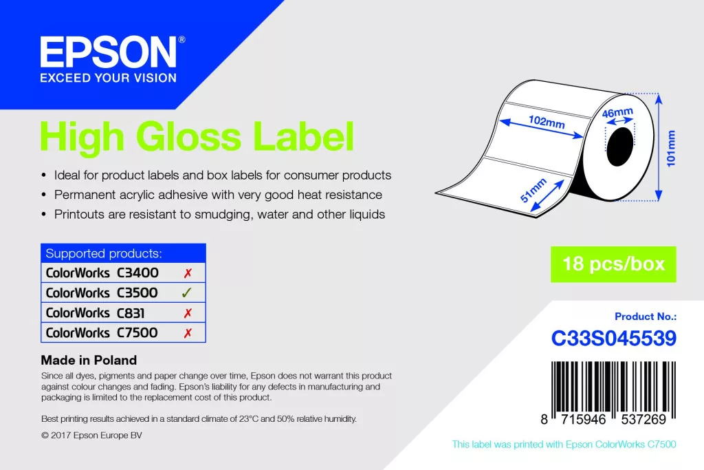 Magasfényű bevonattal rendelkező címke Epson DURABrite Ultra pigmenttintákkal, amely az erősen abszorbens, mikroporózus felületi szerkezetének köszönhetően kiváló minőségű nyomtatást biztosít. A tinta azonnal megszárad, és kiváló nedvesség-, hő- és vízálló tulajdonságainak megfelelően minden alkalommal ellenálló, tartós címkét garantál. A tartós akrilragasztó számtalan különböző felületen kiváló tapadást biztosít.