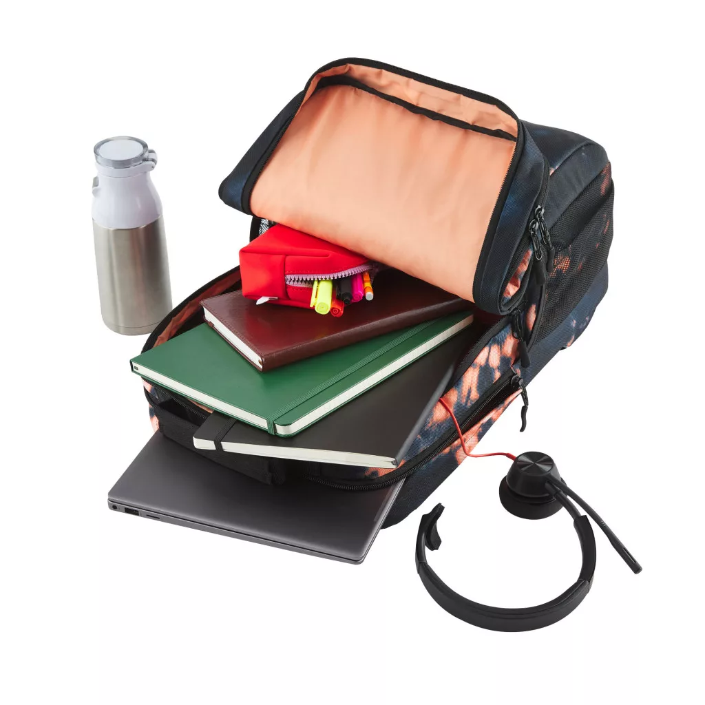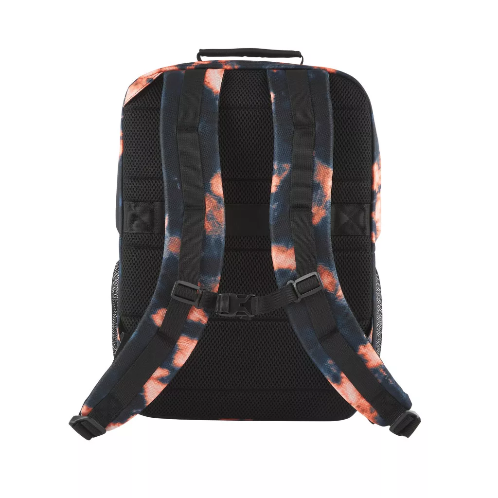 100% poliészter; 20 l; A 11-16 hüvelykes laptopok többségéhez használható ; Kiegészítők; 1 gyors hozzáférést biztosító zseb; 2 vizespalack-/esernyőtartó zseb; Hurok ; Kábelbújtató ;Fekete; Narancssárga Batikolt minta
