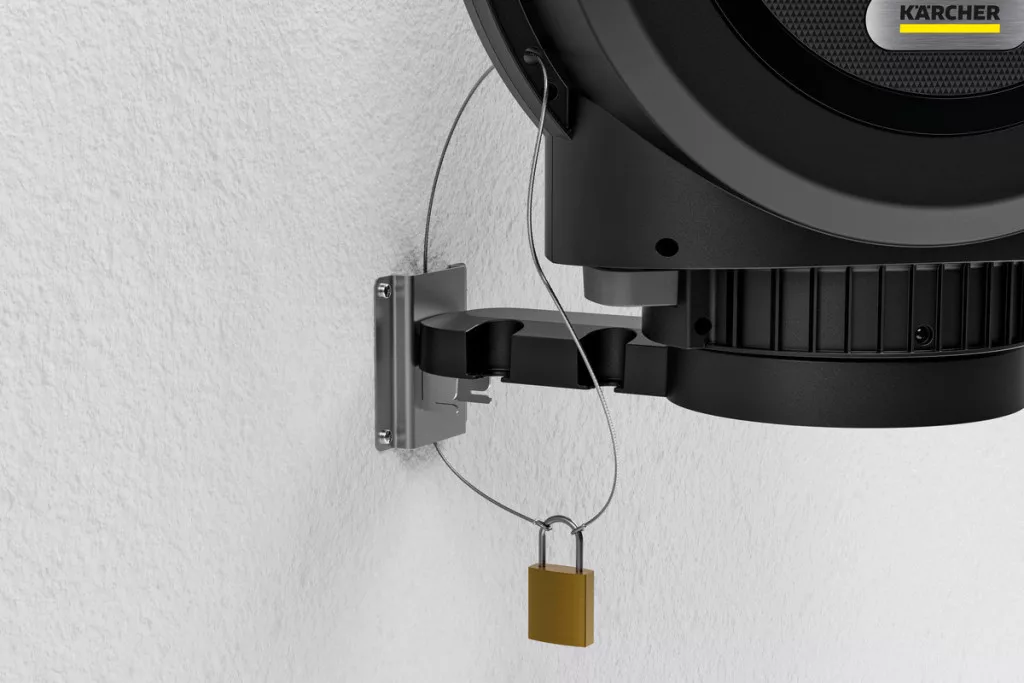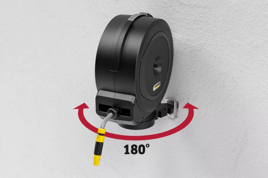 Mindig ideálisan elhelyezhető: a stílusos tömlődoboz a helytakarékosság érdekében a falra van szerelve, és egy csatlakozótömlővel csatlakozik a csaphoz. A fali konzolnak köszönhetően a tömlődoboz több mint 180°-kal elfordítható, így a tömlő könnyedén eléri a kert minden sarkát. A kerti tömlő könnyedén meghosszabbítható maximum 20 méteres hosszúságra. Vannak megfelelő reteszelési fokozatok: a tömlő rövid időközönként teljesen automatikusan bepattan. A tömlő végének gyengéd meghúzása kioldja a reteszelő mechanizmust, így a tömlő automatikusan és szabályozottan, megtörések és csomók nélkül visszahúzódik. Az innovatív FlexChange szerelési rendszerrel a tömlődoboz szerszám nélkül eltávolítható a fali konzolról. Ideális a könnyű tároláshoz télen, vagy rugalmasan használható a fali tartó és a tömlőtüske között, amely opcionális tartozékként kapható. A tömlődoboz UV- és fagyálló is, ezért egész évben a ház falán tartható. A lopás elleni védelem érdekében kábelzár rögzíthető. A Kärcher öt év garanciát vállal a termékre.