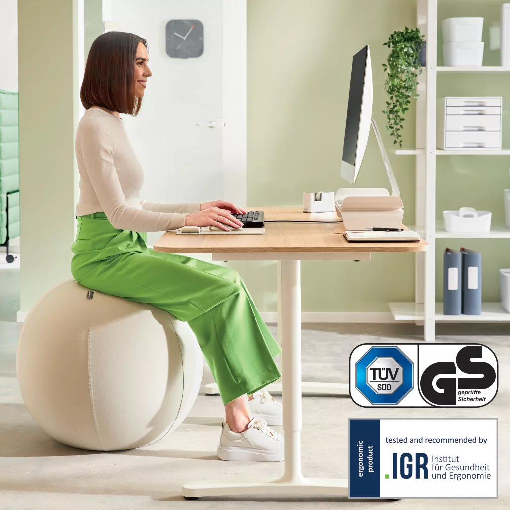 Váltogasd a labdát és a széket 30 percenként a testtartás javítása és a hátfájás megelőzése, enyhítése érdekében, használat előtt győződj meg arról, hogy a labda a kézikönyvben leírtak szerint van felfújva (A német IGR Egészségügyi és Ergonómiai Intézet által a DIN 26800 EN ISO 15537 szabvány szerint tesztelt és ajánlott termék)