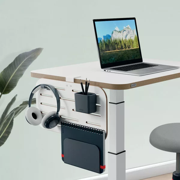 Lyukacsos asztali rendszerező egyedi, széles nyílásokkal, hogy helyet szabadíts fel, és rendben tartsd asztalodat. Rögzítsd a függőleges tárolót a napi szinten használt eszközök rendszerzéséhez. Tartsd rendben íróasztalodat és hozd ki a legtöbbet a rendelkezésre álló helyből a Leitz Ergo függőleges asztali rendszerezővel. Ez az egyedülálló, függőleges asztali rendszerező könnyen felszerelhető az asztal tetejére vagy alá, és azonnali tárolást biztosít mindennek - a fejhallgatóktól kezdve, a jegyzettömbökön át a tollakig. Tartsd minden lényeges eszközödet kéznél, rendezetten, és szabadíts fel értékes helyet az asztalon. Egyszerűen helyezd az erős, 85%-ban újrahasznosított műanyagból készült tárolótartozékokat (1 x füzettartó, 1 x tolltartó és 1 x fejhallgató akasztó) a táblára és hozd létre saját, személyre szabott munkaterületedet. A Németországban tervezett és a legtöbb 35 mm-es maximális asztallapvastagságú íróasztallal kompatibilis, könnyen felszerelhető függőleges rendszerező értékes kiegészítője a Leitz Ergo ülő-álló asztalnak (65340001 vagy 65360001). A 8 mm vastag MDF tábla szilárd és stabil alapot biztosít, a puha gumipárnák pedig védik az asztal felületét a karcolásoktól. Ez a modern és minimalista lyukacsos rendszerező ideális otthonra vagy az irodába a kényelem és a termelékenység maximalizálása érdekében. Küldetésünk, hogy olyan megoldásokat kínáljunk, amelyek lehetővé teszik az irodai dolgozók számára, hogy a munkahelyükön és azon túl is jól érezzék magukat, elősegítve a pozitív mentális egészséget és a fizikai jóllétet. Más Leitz Ergo termékekkel kombinálva rugalmas és mozgásra ösztönző munkaállomást alakíthatsz ki. Maradj aktív és ÉREZD JÓL magad a Leitz segítségével.