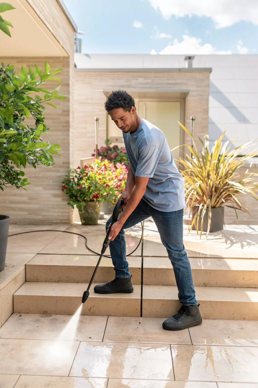 A K 3 FJ Home magasnyomású mosóval a szennyeződés a múlté. A 6 méteres nagynyomású tömlőnek köszönhetően a mosó tökéletes az otthoni alkalmi használatra, és ragyogó fényt ad a kisebb kerti felületeknek és teraszoknak, valamint a kerti bútoroknak és az autóknak. A Home Kit garantálja az otthon körüli nagyobb területek fröccsenésmentes tisztítását, és tartalmazza a T 1 felülettisztítót és az 500 ml Patio & Deck tisztítószert. A Vario Power szórópisztoly (VPS) segítségével a víznyomás egy egyszerű csavaró mozdulattal könnyen beállítható a felületnek megfelelően. A forgó foltfúvókával ellátott Dirt Blaster a legmakacsabb szennyeződéseket is fellazítja, a szivattyút pedig vízszűrő védi - a hosszú élettartam érdekében. A kiegészítő habsugárral és 500 ml autósamponnal a maximális szennyeződésoldó erő érdekében. A sima futású kerekeknek köszönhetően a K 3 FJ Home magasnyomású mosó könnyen szállítható oda, ahol szükség van rá.