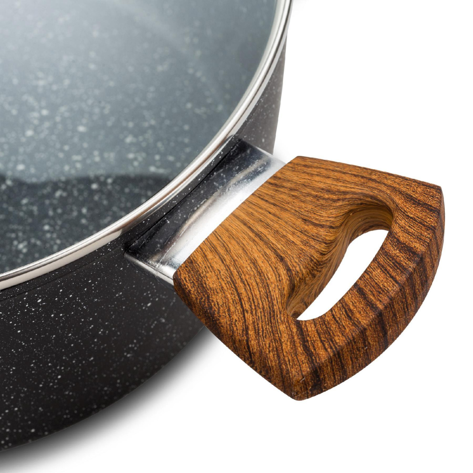 Egy lábast keres, amelyikkel egészségesen és hatékonyan készítheti el kedvenc ételeit? Fedezze fel a 28cm átmérőjű Nava 10-144-122 Nature tapadásmentes lábast, amely kiváló minőségű alumíniumból készült, és öt rétegű, tapadásmentes kőbevonattal rendelkezik. A kiváló és tartós tapadásmentes bevonat nagy ellenállást biztosít a karcolásokkal és a magas hőmérsékletekkel szemben. A gyártás során kis szén-dioxid-kibocsátású eljárásokat alkalmaznak, és a PFOA-t kiiktatják. Az öt rétegű tapadásmentes belső bevonat hosszú tartósságot biztosít a mindennapos használathoz, és tökéletes, egészséges főzési élményt garantál úgy, mintha természetes kövön sütne vagy főzne. A csúszásmentes, ergonomikus, fa mintázatú fogantyú még órákig tartó főzés után is hűvös marad, és könnyű használatot tesz lehetővé. A Nava Nature lábas hirtelen hőmérséklet-változásoknak ellenáll, és nagyon könnyen tisztítható. Minden tűzhelytípushoz alkalmas: gáz, elektromos, kerámia, halogén és indukciós. Aljának átmérője 19cm, űrtartalma 6,6 liter. Mosogatógépben is tisztítható. Használat előtt mosogassa el a lábast meleg, szappanos vízzel és puha szivaccsal. Minden használat előtt kenje be a lábas belső felületét olajjal vagy vajjal. Ne hevítse túl a lábast üresen, és távolítsa el a tűzhelyről, mielőtt a tartalma elpárologna. Alacsony vagy közepes hő elegendő a legjobb főzési eredmények eléréséhez. A lábas hirtelen hőmérséklet-változásoknak ellenáll. Hosszabb élettartam érdekében hagyja lehűlni, majd mosogassa meleg, szappanos vízzel és puha szivaccsal. Használjon fa, műanyag vagy szilikon konyhai eszközöket a tapadásmentes bevonat élettartamának meghosszabbítása érdekében. Soha ne vágja az ételt éles eszközökkel a lábasban. Használjon olyan tűzhelyet, amely azonos méretű vagy kisebb, mint a lábas alja. Ne hevítse túl a zsírt vagy az olajat füstölésig, égésig. Ne használjon fémszivacsokat, drótot vagy erős tisztítószereket. A tapadásmentes bevonat megfelel az élelmiszerrel való érintkezésre vonatkozó előírásoknak. A Nava Nature lábas nem csak a konyhájának praktikus kiegészítője, hanem hosszú távon megbízható társa is lesz az egészséges és ízletes ételek elkészítésében. Ne várjon tovább, tegye meg az első lépést a minőségi és ízletes főzés felé még ma!